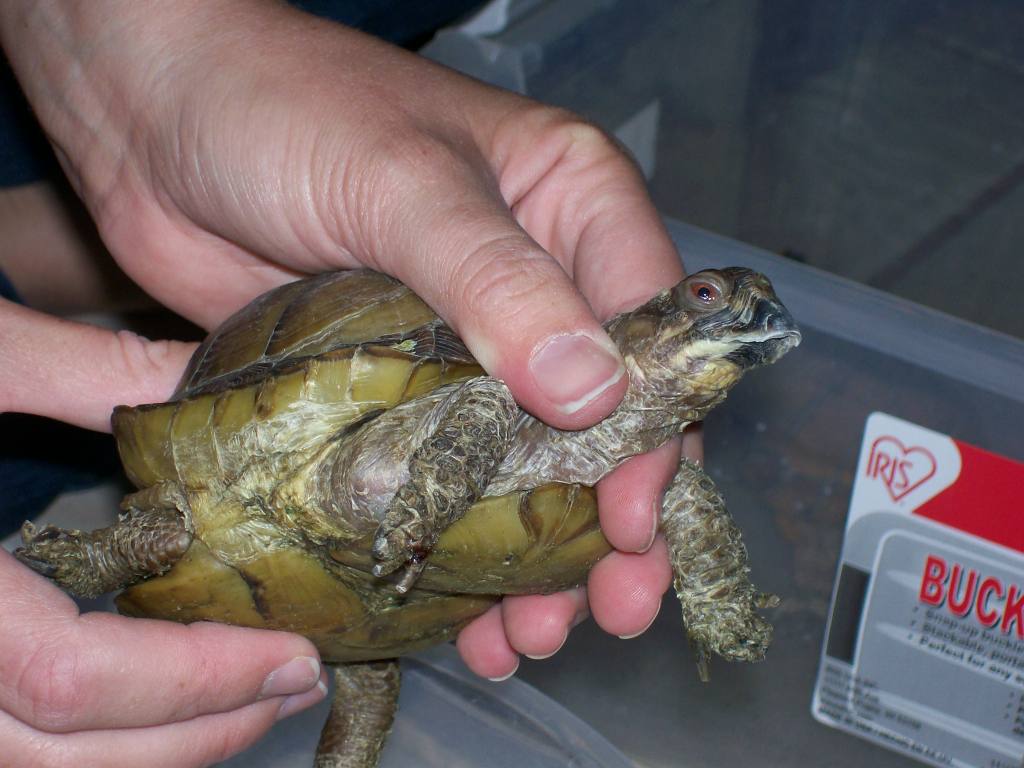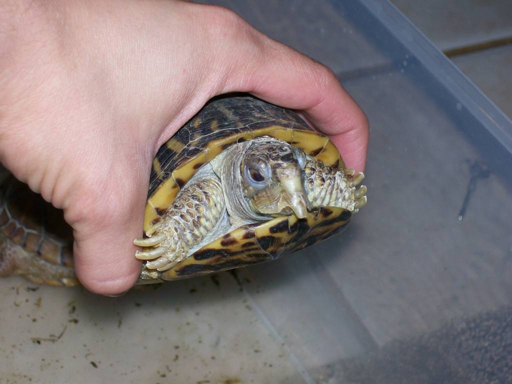 ______________________________________ This is a female ornate box turtle that was kept indoors with no heat, food or water. She was dehydrated and extremely skinny. Her beak was overgrown, and her nails and skin were thin and dry.