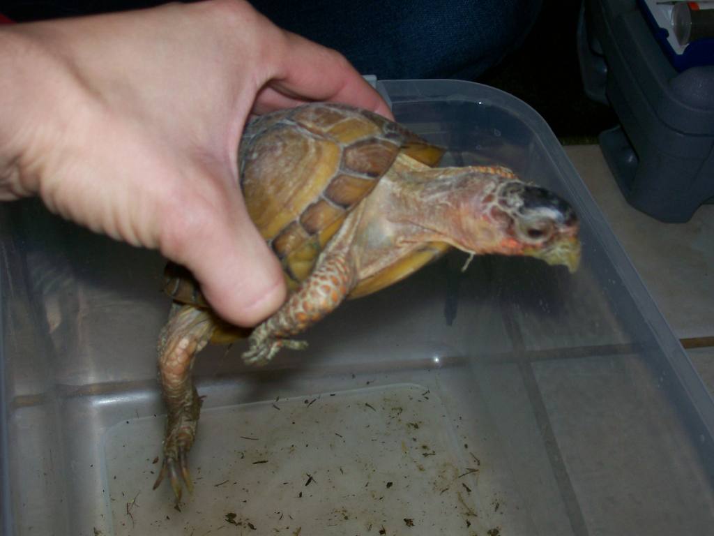 _____________________________________ This is a female 3-toed box turtle that was kept indoors with no heat, food or water. Her beak and nails were severely overgrown. Her skin was very dry and thin and her muscles weak. When she was first placed on solid ground, she had difficulty walking and her nails actually bled.